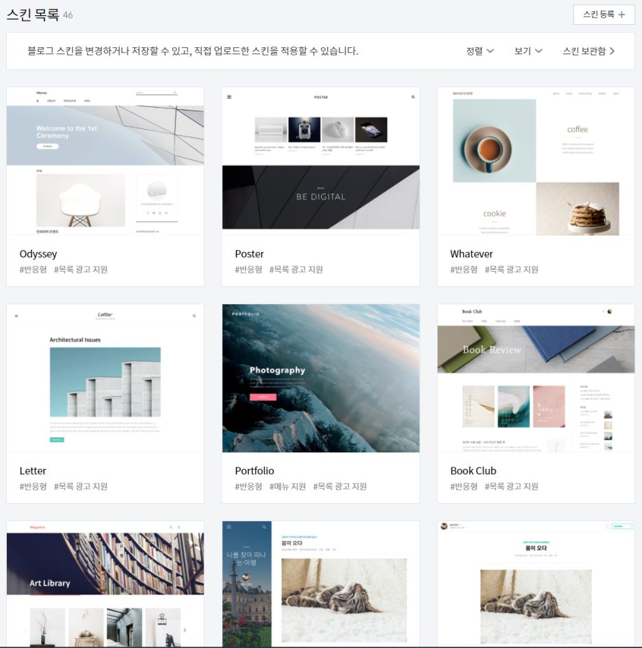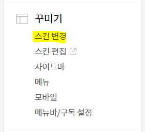 스킨은 관리-꾸미기-스킨변경 탭에서 변경할 수 있습니다.
